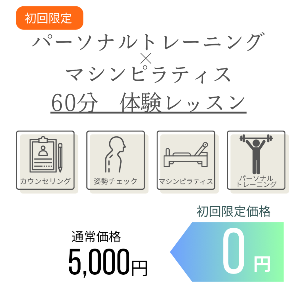 パーソナルトレーニングとピラティスの両方を体験できる内容で、ダイエットや姿勢改善に効果的。運動が久しぶりの方や、ジム選びで迷っている方にも安心して通っていただけます。まずは4回から、あなたに合った運動習慣を見つけてみませんか?
